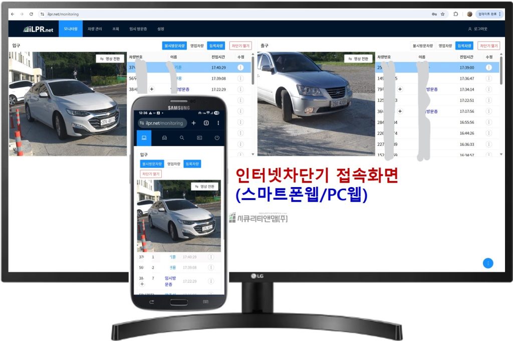 출장중이나 집에 있어도, 심지어는 해외여행중이라도 스마트폰에서 인터넷접속만 하면 현재 입구에 들어온 차량을 실시간으로 확인할 수 있으며, 스마트폰으로 바로 차량차단기를 열어줄 수 있습니다. 물론, 이 과정을 순조롭게 하려면 입구에 스마트폰 번호를 크게 붙여줘야겠죠?